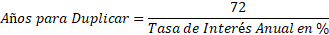 - Ejemplo: Si tu inversión rinde un 8% anual: 72 ÷ 8 = 9 años. Tu dinero se duplicará cada 9 años.